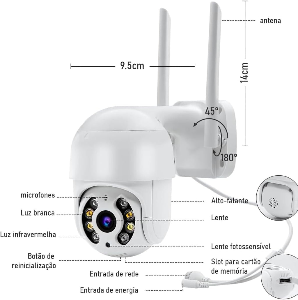 Armazenamento Flexível: Opção em nuvem ou cartão de memória até 128GB. Resistência e Desempenho em Qualquer Clima Construída para suportar chuva e sol, a câmera é à prova d’água e conta com visão noturna de até 25 metros, garantindo proteção 24 horas por dia.