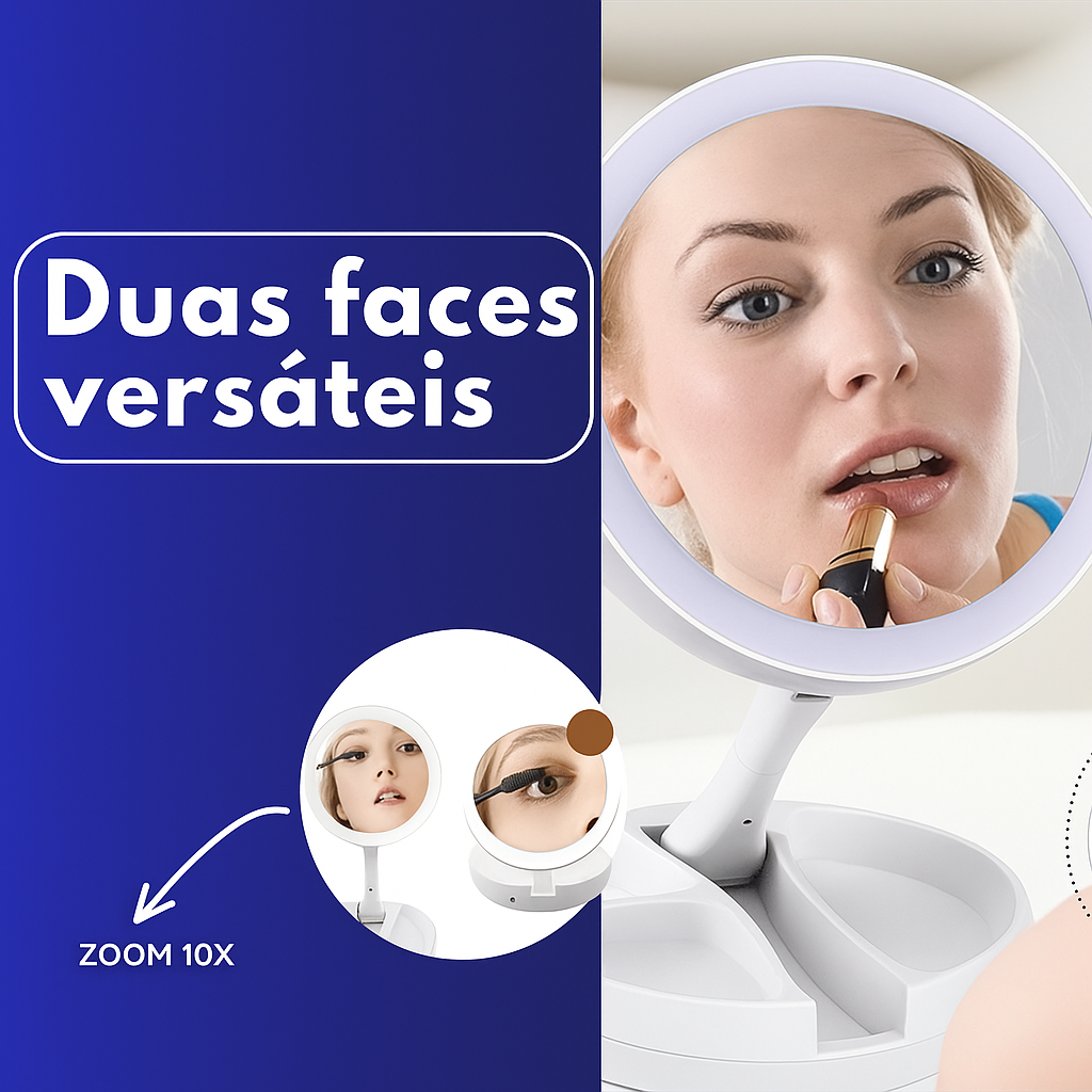 Por ser dobrável e acompanhar em sua base um organizador de maquiagem, leve e compacto, ocupa pouco espaço, sendo ideal para guardar na bolsa, na mala de viagem e até mesmo em casa. Além de ter um design elegante, este espelho de maquiagem com dupla face é iluminado com LEDs, sendo muito prático. Basta abrir um botão na parte inferior do suporte para ligar as luzes LED.